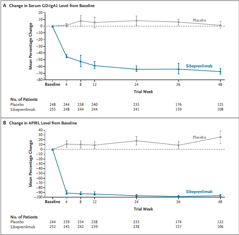 在生物标志物方面,斯贝利单抗组第4周时Gd-IgA1降低44.6%,48周最大降幅达67.1%;血清游离APRIL第4周时下降90.2%,48周维持95.8%抑制(图2);总IgA、IgM、IgG分别下降68.8%、74.5%、35%,提示APRIL阻断后对多克隆免疫球蛋白合成具有广泛抑制,但以IgA/IgM最为显著。