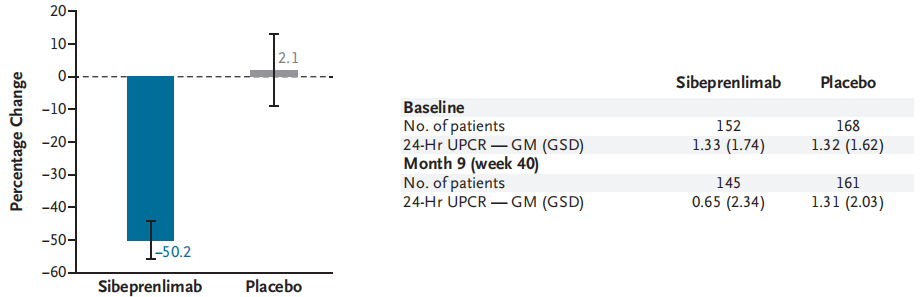 在蛋白尿缓解和血尿方面,斯贝利单抗组在48周时蛋白尿缓解(<0.5 g/d)为34.3%,显著高于对照组的12.7%;48周时,镜下血尿阳性率从78.3%降至19.8%,而对照组仍为69%。
