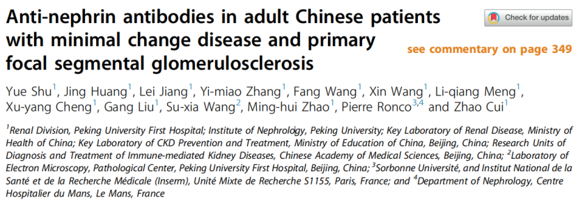微小病变病(MCD)和原发性局灶性节段性肾小球硬化症(FSGS)是肾病综合征的主要病因之一,其病理生理机制尚未完全明确。近年来,研究发现免疫失调,特别是自身抗体的参与,可能在这些疾病的发生中起重要作用。抗nephrin自身抗体在MCD和FSGS患者中已被发现,尤其是在那些处于肾病综合征活动期的患者中。近期,北京大学第一医院肾内科专家团队的一项新研究发表在肾病领域权威期刊KI,旨在调查抗nephrin抗体在成人中国患者中的流行率及其临床意义。