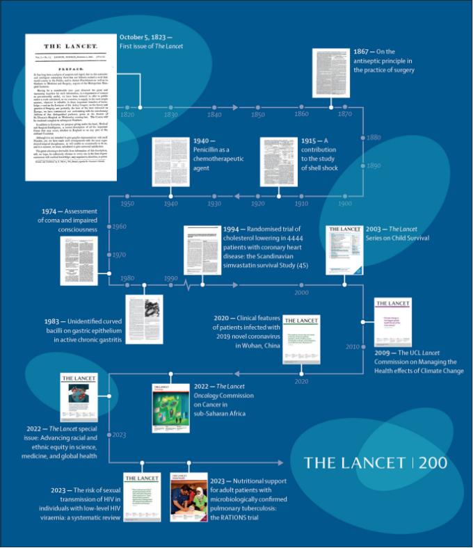 回溯两百年时光轴,《柳叶刀》的每一步都与医学进步同频共振,在不同时代留下了里程碑式的科研印记。1847年,它率先关注比硫酸乙醚更高效的新型麻醉剂,为外科手术的无痛化革命铺就基石;1867年,刊载外科消毒原则的重要研究,彻底扭转了外科医疗中感染肆虐的局面。进入20世纪,1915年的壳震荡(创伤后应激障碍)研究填补了战场心理创伤领域的空白;1940年聚焦青霉素的化疗应用,见证了抗生素时代的正式开启;1951年推广多刺结核菌素试验,为结核病防控提供了关键检测手段;1958年探索脉冲超声在腹部肿块诊断中的潜力,推动医学影像技术迈入临床实用阶段;1974年确立昏迷与意识障碍评估标准,为重症救治提供了科学统一的判断依据。