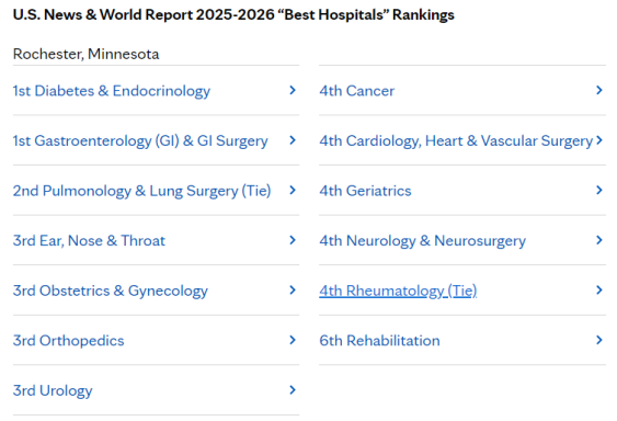 当谈及全球顶尖医疗标杆,梅奥诊所(Mayo Clinic)的名字始终闪耀着不可替代的光芒。在U.S. News & World Report 2025-2026年度“最佳医院”排名与Newsweek 2025榜单中,它不仅蝉联“全球最佳医院”桂冠,更以13个专科跻身全美前列的耀眼成绩,成为医疗领域卓越与创新的代名词。