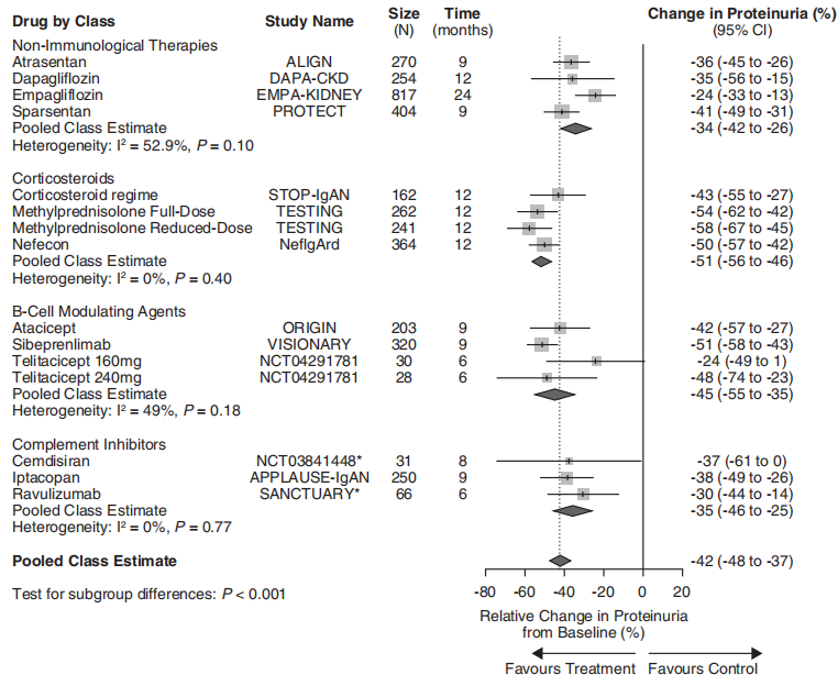 二、研究结果(一)基线特征纳入试验的患者基线特征存在一定异质性。整体而言,37%为女性,平均年龄43岁,基线平均eGFR为60 ml/min·1.73m2,RAS抑制剂使用率普遍较高,种族构成中亚洲人群占比较大(部分试验中占比超50%),随访时长最短28周,最长平均4.2年。不同药物类别试验的纳入标准、基线蛋白尿水平等存在差异,如非免疫疗法中的DAPA-CKD试验纳入eGFR 25~75 ml/min·1.73m2且尿白蛋白肌酐比(UACR)200~5000mg/g的患者,而糖皮质激素类的TESTING试验则要求患者蛋白尿≥1 g/d、eGFR 20~120 ml/min·1.73m2。