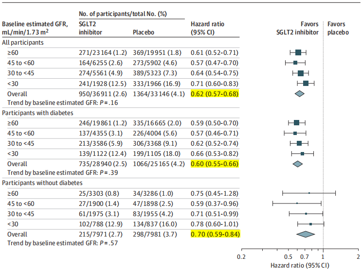 按eGFR分层:无论eGFR≥60、45~60、30~45或<30 ml/min/1.73m2,SGLT2i均显著降低CKD进展风险,HR分别为0.61、0.57、0.64和0.71,趋势检验P值为0.16,提示无显著异质性。