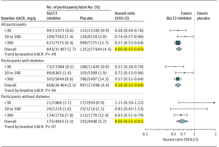 按UACR分层:在UACR<30、30~300和>300 mg/g的患者中,HR分别为0.58、0.74和0.57,趋势检验P值为0.49,同样显示疗效一致。