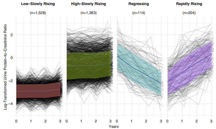 图2. 轨迹建模识别出四种不同的蛋白尿轨迹组