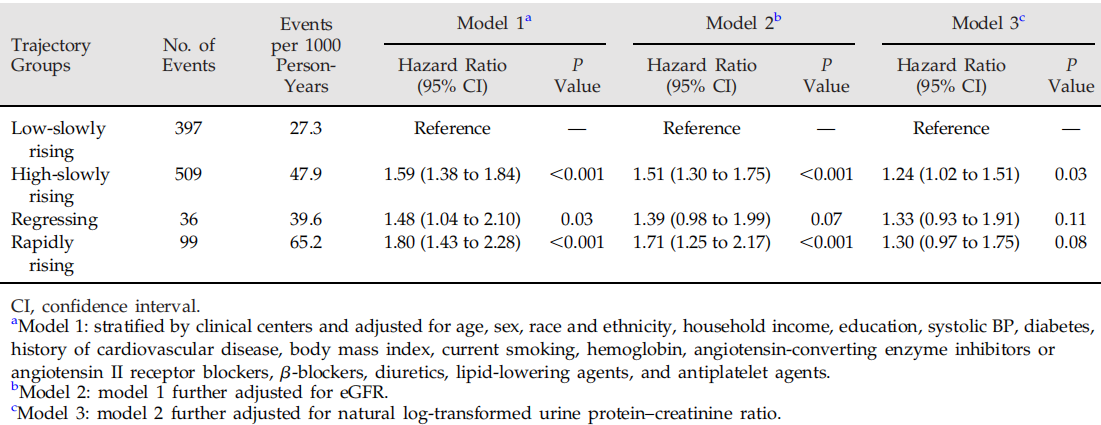 基线特征比较显示,与低水平缓慢上升型相比,其他三种轨迹亚型患者的社会经济地位更低、合并症(糖尿病、心血管疾病)患病率更高、eGFR更低。其中快速上升型患者糖尿病患病率(71%)和收缩压(138 mmHg)最高,eGFR最低(40 ml/min/1.73m2);回归型患者ACEI/ARB使用率(78%)和利尿剂使用率(72%)最高,且年龄相对较轻(平均61岁)。