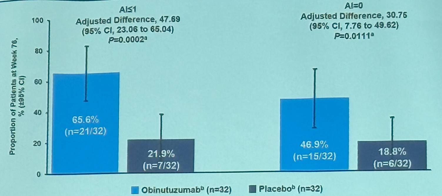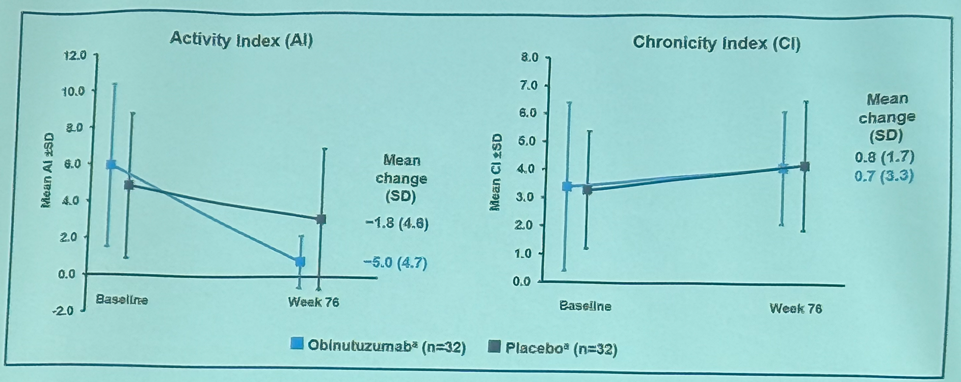 本研究纳入64份配对的基线与第76周肾活检标本,其中OBI+ST组与PBO+ST组各32份。所有标本由阿卡纳实验室采用2018年国际肾脏病学会/肾脏病理学会(ISN/RPS)狼疮肾炎分类标准,并结合美国国立卫生研究院(NIH)活动指数(AI)和慢性化指数进行盲法阅片评估。研究统计了达到组织学缓解或接近组织学缓解(即活动指数AI=0或AI≤1)的患者比例。