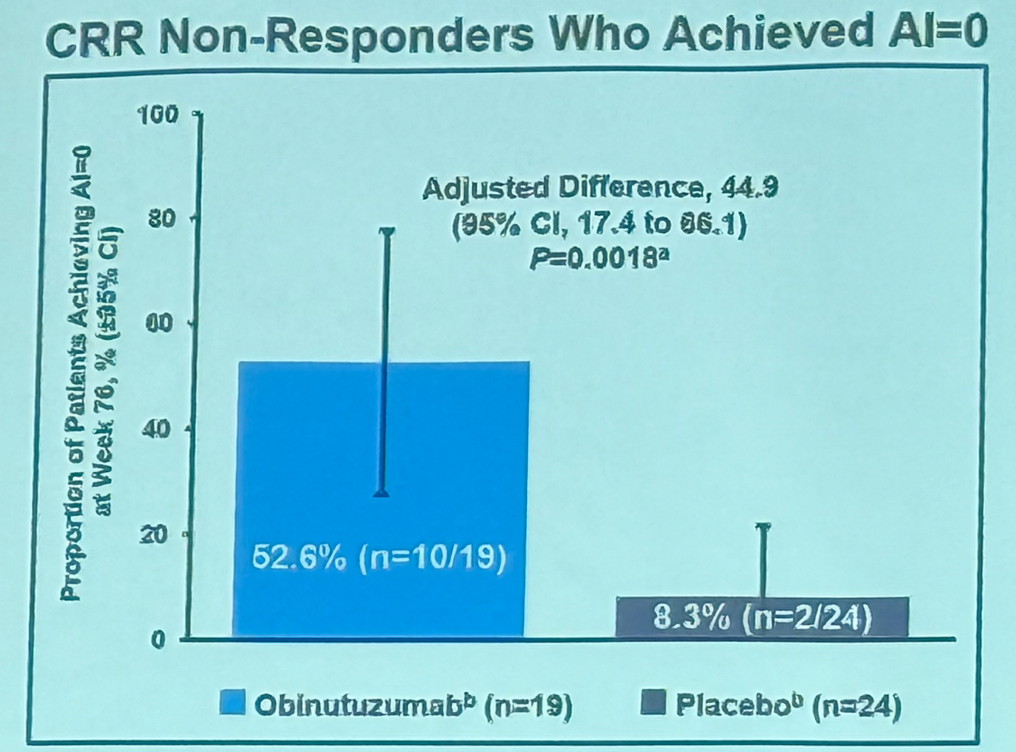 图4. 第76周时,奥妥珠单抗组中超过半数未达到临床完全肾脏应答(CRR)的患者,实现了组织学缓解(活动指数=0)