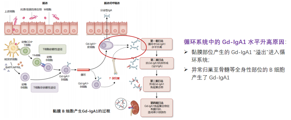 IgA肾病的核心发病机制为“四重打击”学说,Gd-IgA1是关键致病因子。肠道相关淋巴组织(GALT)中的黏膜B细胞异常活化产生Gd-IgA1,其水平升高进入体循环后,诱导产生自身抗体并形成免疫复合物,最终沉积于肾小球激活补体,引发肾脏损伤(图1)。研究证实,Gd-IgA1循环水平与肾脏预后密切相关,其水平越高,患者肾脏存活率越差[5];肠道黏膜派尔集合淋巴结是产生Gd-IgA1的重要场所[6]。此外,肠道微生物(如埃希氏菌-志贺氏菌)、遗传因素及免疫因素等均参与疾病发生发展,为靶向治疗提供了多个潜在靶点。
