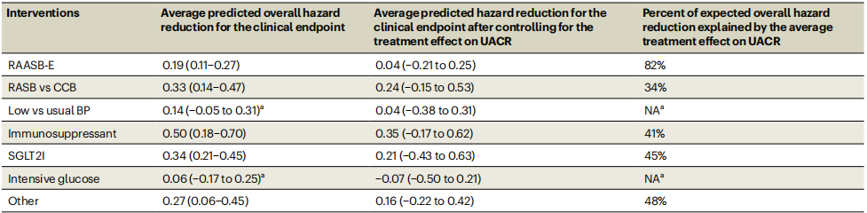 表2. 不同干预手段中,由UACR下降所解释的临床终点治疗效益占比