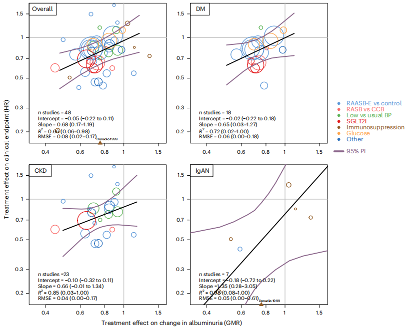 结果显示,48项试验中,治疗导致UACR较基线降低25%(GMR 0.75;95%CI:0.71~0.79),硬终点风险降低24%(HR 0.76;95%CI:0.71~0.82)。meta回归斜率0.68(95% BCI 0.17~1.19),提示几何平均数UACR每降低30%,硬终点风险平均降低19%(95% BCI 5~30%)。R2中位数0.66(95% BCI 0.06~0.98),后验概率45%达到“强替代”,28%为“弱替代”,截距-0.05,基本通过零点,符合“无UACR变化即无平均临床获益”的因果前提。