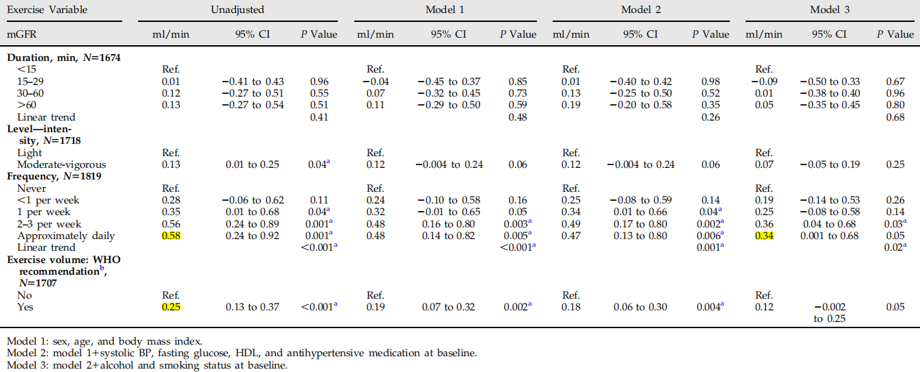 表1. 身体活动与测定GFR年下降率的相关性(N=1837)