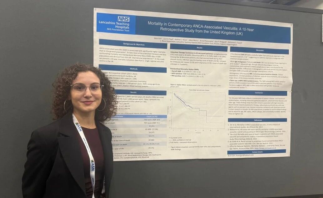 在2025年美国肾脏病学会(ASN)年会上,来自英国兰开夏教学医院NHS基金会信托(Lancashire Teaching Hospitals NHS Foundation Trust)的Buse Gün博士展示了一项关于抗中性粒细胞胞浆抗体相关性血管炎(ANCA-associated vasculitis,AAV)的十年回顾性研究(FR-PO0883)。该研究聚焦英国当前AAV人群的死亡率变化,并探讨临床特征与预后之间的关联。肾医线记者现场邀请研究第一作者Buse Gün博士对其研究进行了解读。