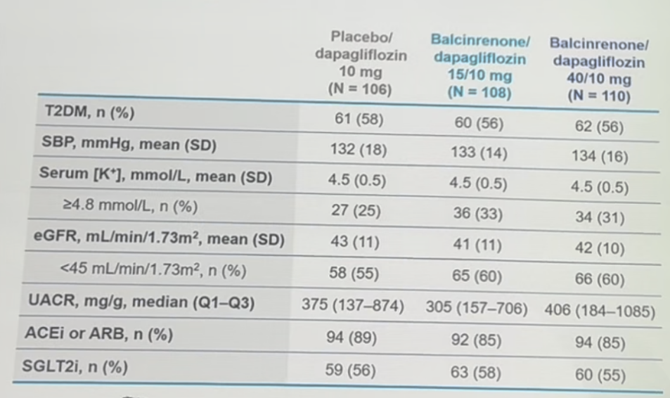 平均年龄65岁,男性约占三分之二;平均eGFR为42 ml/(min·1.73m²),中位UACR为365 mg/g(第25、75百分位数分别为157、825);约半数患者患有2型糖尿病,56%的患者入组时已使用SGLT2i(表1)。