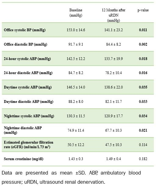 15例来自埃尔兰根/纽伦堡中心的CKD 3期且高血压未控制的患者接受uRDN,12个月后评估其诊室和24小时动态血压和肾功能(表1)。结果显示,24小时动态收缩压和舒张压分别下降8.7±12.7 mmHg和6.5±9.3 mmHg;诊室血压下降更明显,平均收缩压下降11.9±16.4 mmHg,舒张压下降7.3±7.9 mmHg,且降压效果在未调整降压药物剂量的情况下维持12个月。与基线相比,肾功能在随访期间保持稳定,未见与uRDN相关的不良事件。