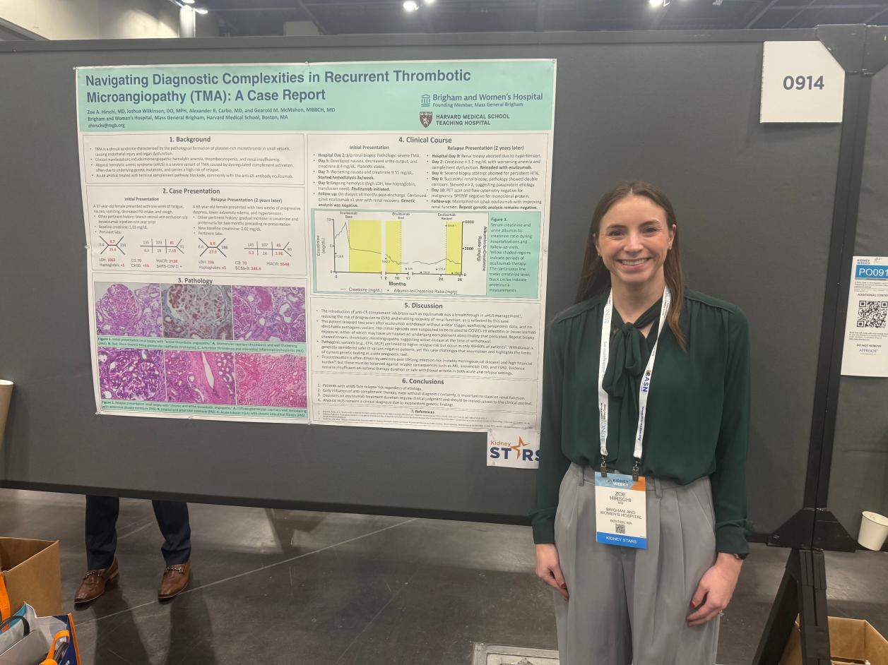 血栓性微血管病(TMA)是一类以微血管内血栓形成、内皮损伤为特征的危重疾病,常累及肾脏,可导致急性肾损伤甚至多器官衰竭,其病因复杂、预后异质性大且复发风险不容忽视。近年来,随着补体抑制剂的应用,部分患者的预后显著改善,但复发性TMA的诊断与长期管理仍面临巨大挑战。在2025年美国肾脏病学会(ASN)年会上,美国布莱根妇女医院的Zoe A. Hirschi博士以壁报形式展示了一例COVID-19相关复发性TMA病例报告(摘要号:FR-PO0914),引发了学界对该病诊断复杂性与治疗决策的广泛讨论。《肾医线》记者在会议现场邀请该壁报研究第一作者Zoe A. Hirschi博士接受专访,深入解析了病例背后的临床挑战与研究方向。