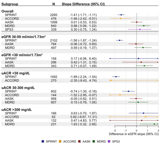 图1. CKD试验患者中强化血压控制组与标准血压治疗组之间的eGFR斜率差异(总体及按基线eGFR和白蛋白尿分层分析结果)