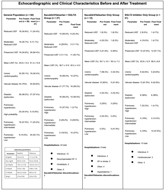 研究回顾性分析了60例起始使用SGLT2抑制剂和/或沙库巴曲/缬沙坦治疗的CKD合并心力衰竭患者。60%为男性,平均年龄40.9岁(±14.7)。88.5%的患者接受肾脏替代治疗,其余为透析前患者,平均估算肾小球滤过率(eGFR)为17.4 ml/(min·1.73m2)。CKD病因包括不明原因(39.3%)、糖尿病(22.9%)、狼疮(16.3%)和肾小球疾病(14.7%)。治疗方案方面,45%的患者联合使用两种药物,20%仅使用沙库巴曲/缬沙坦,35%仅使用SGLT2抑制剂。SGLT2抑制剂的平均治疗持续时间为660天,沙库巴曲/缬沙坦为768天。基线时,射血分数降低型心力衰竭(HFrEF)和射血分数保留型心力衰竭(HFpEF)的患病率相同(均为34.6%)。超声心动图异常包括尿毒症心肌病(55.1%)、瓣膜病(75%)和舒张功能障碍(48.2%)。随访超声心动图显示,左心室射血分数(LVEF)、瓣膜病变和舒张功能均有改善(表1),实验室指标保持稳定。随访期间,共记录43例住院事件和5例死亡病例。