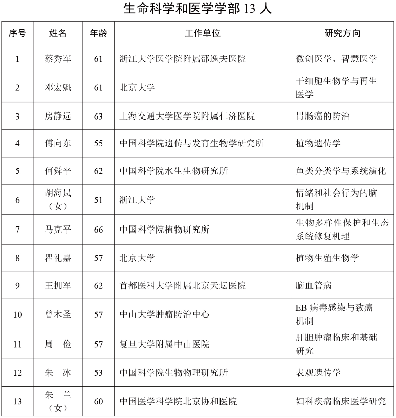 根据《中国科学院院士章程》《中国科学院院士增选工作实施办法(试行)》《中国科学院外籍院士选举办法》等规定,2025年中国科学院选举产生了73名中国科学院院士、27名中国科学院外籍院士。其中,生命科学和医学学部新增共13名院士,详细名单见表1。