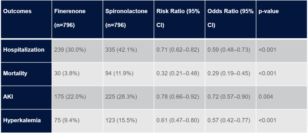 该研究基于TriNetX数据库中101家医疗机构的患者数据,开展了一项回顾性队列分析。经1:1倾向评分匹配后,将HFpEF患者分为两组:一组接受非奈利酮治疗(n=796),另一组接受螺内酯治疗(n=796)。对12个月期间住院、全因死亡、急性肾损伤(AKI)和高钾血症等结局进行评估。结果证实,无论在改善临床结局还是安全性方面,非奈利酮均显著优于螺内酯(表1)[3]。