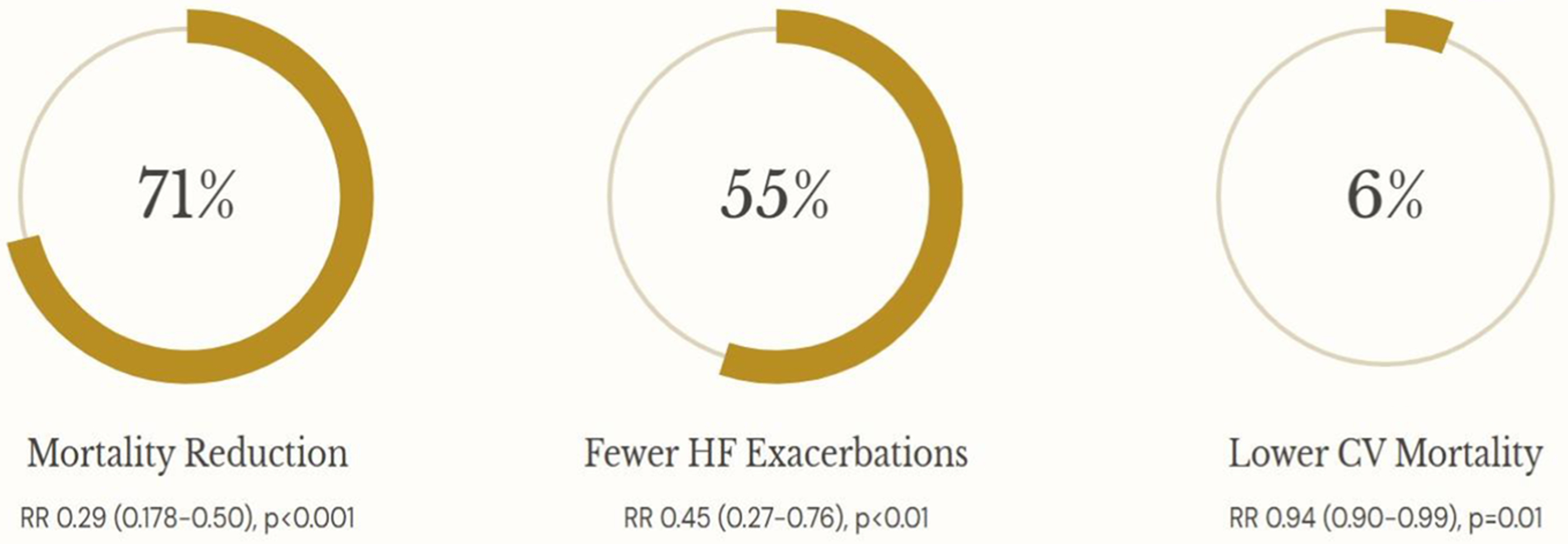 心衰加重风险显著降低55%(RR 0.45,95%CI:0.27~0.76,P<0.01);