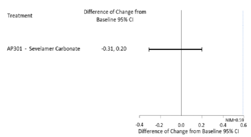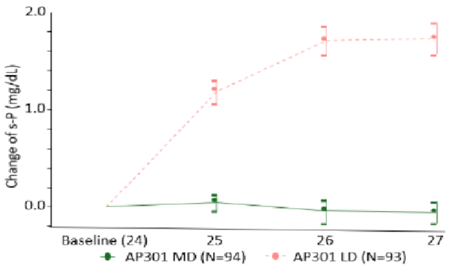 最终396例(84%)完成研究。第12周时,AP301组与SEV组的血清磷较基线平均变化(±标准误)分别为-2.2±0.1 mg/dl和-2.2±0.1 mg/dl,显示AP301具有非劣效性(95%CI上限0.19 mg/dl,低于预设非劣效界值0.59 mg/dl)(图2)。第27周时,主要终点结果显示维持剂量组相对于低剂量组具有临床显著优效性(最小二乘均数差异-1.8 mg/dl,95%CI:-2.1~-1.5;P<0.001)(图3)。AP301的疗效持续维持至第52周。