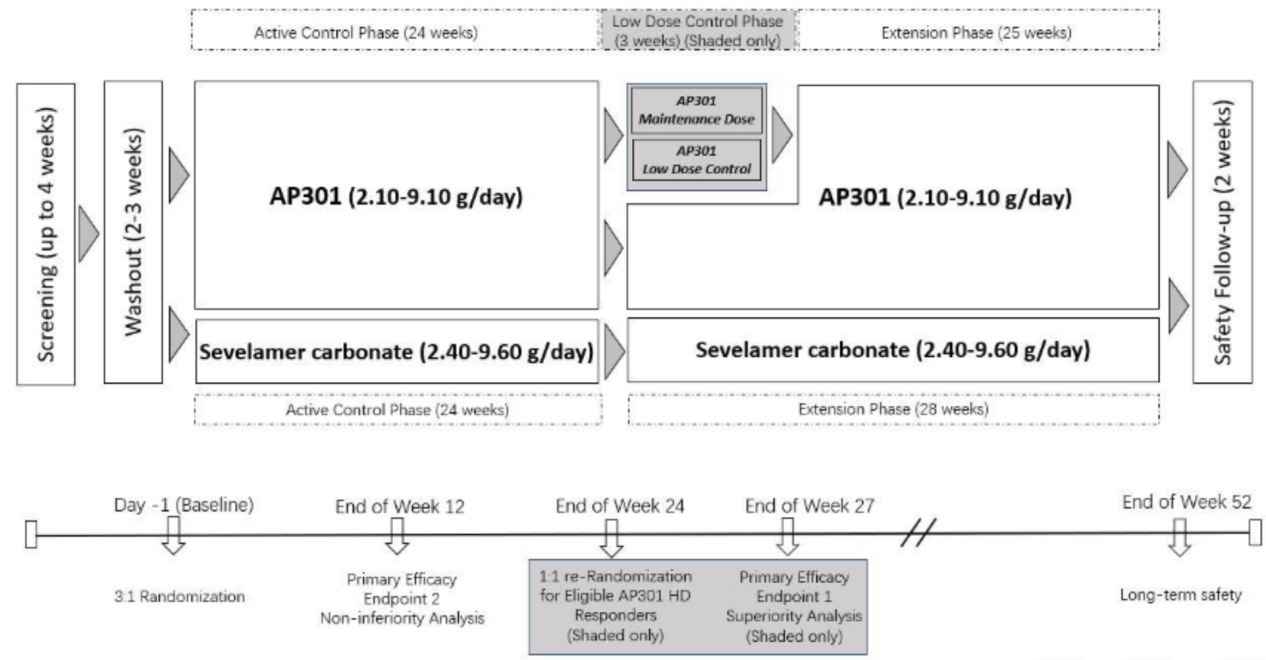 P301是一种新型非吸收性铁基磷酸盐结合剂,无需咀嚼服用。北京大学人民医院左力等开展一项为期52周的Ⅲ期临床试验,评估了AP301治疗透析相关性高磷血症患者的疗效和安全性。该试验入选ASN2025的“Late-Breaking Research”,以壁报形式在大会上展示。