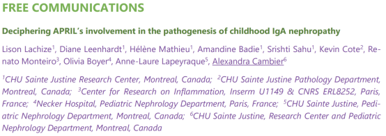 在第18届IgA肾病国际研讨会(IIgANN 2025)上,加拿大蒙特利尔CHU Sainte-Justine医院的Alexandra Cambier教授及其团队的研究,首次深入揭示了细胞因子APRIL在儿童IgA肾病中的关键作用,及其作为生物标志物和治疗靶点的巨大潜力。《肾医线》特邀Cambier教授进行深度访谈,请她就儿童与成人IgA肾病的核心差异、APRIL的致病机制、临床转化挑战以及未来诊疗优先方向分享了其独到见解。