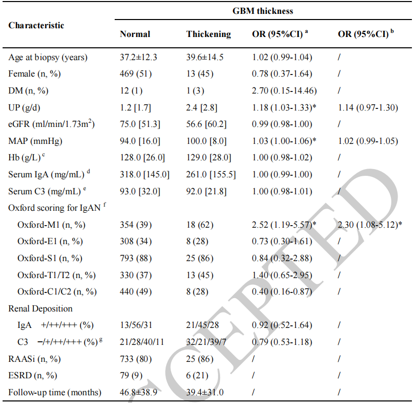 研究还分析了GBM特征与临床参数以及光镜和免疫荧光病理参数之间的相关性。结果显示,GBM增厚与活检时的尿蛋白水平和平均动脉压呈正相关(表1)。进一步的分析表明,即使在调整平均动脉压后,GBM增厚的患者仍有较高的ESRD风险(HR=2.89,95%CI:1.16~6.00)。此外,GBM增厚与牛津分类M1评分(表示系膜细胞增生)呈正相关。通过免疫荧光染色,研究发现GBM增厚的IgA肾病患者中,系膜细胞增殖率增加。这些结果表明,系膜细胞增殖可能与IgA肾病患者中GBM增厚有关。