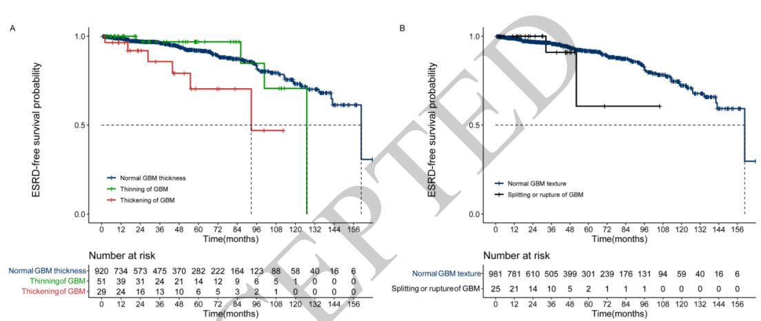 研究发现,GBM增厚的患者中,中位ESRD无事件生存时间显著短于GBM正常厚度的患者(92.7个月 vs. 160.8个月,P=0.014,图1A)。然而,GBM变薄的患者与GBM正常厚度的患者之间在中位ESRD无事件生存时间上没有显著差异(127.0个月 vs 160.8个月,P=0.14,图1B)。