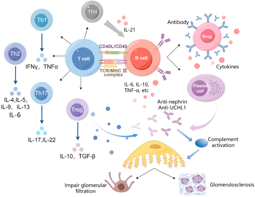 B细胞作为抗原呈递细胞,通过MHC-Ⅱ分子和共刺激信号激活CD4+T细胞,促进Th1、Th2、Th17等效应T细胞亚群的活化。B细胞与T细胞、巨噬细胞等免疫细胞相互作用,形成炎症放大网络,进一步损伤肾小球。