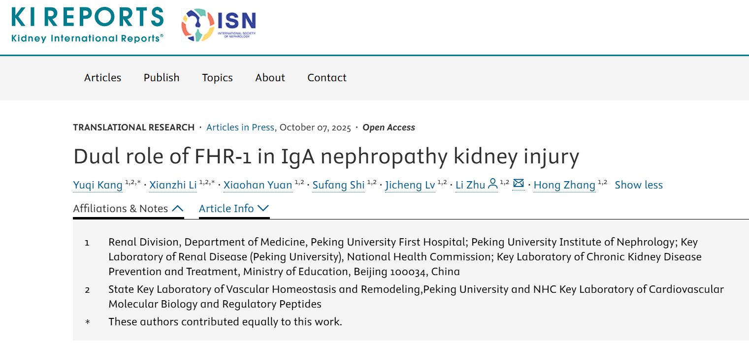来源:Kang Y, Li X, Yuan X, Shi S, Lv J, Zhu L, Zhang H, Dual role of FHR-1 in IgA nephropathy kidney injury, Kidney International Reports (2025), doi: https://doi.org/10.1016/j.ekir.2025.09.047