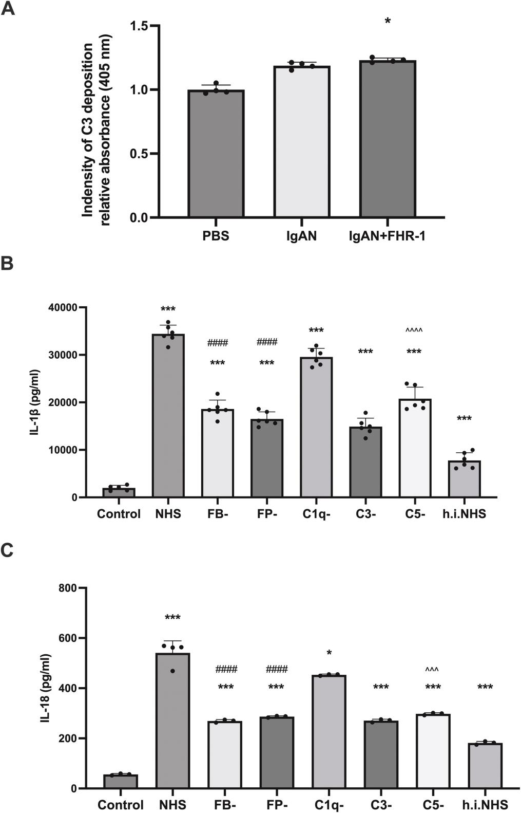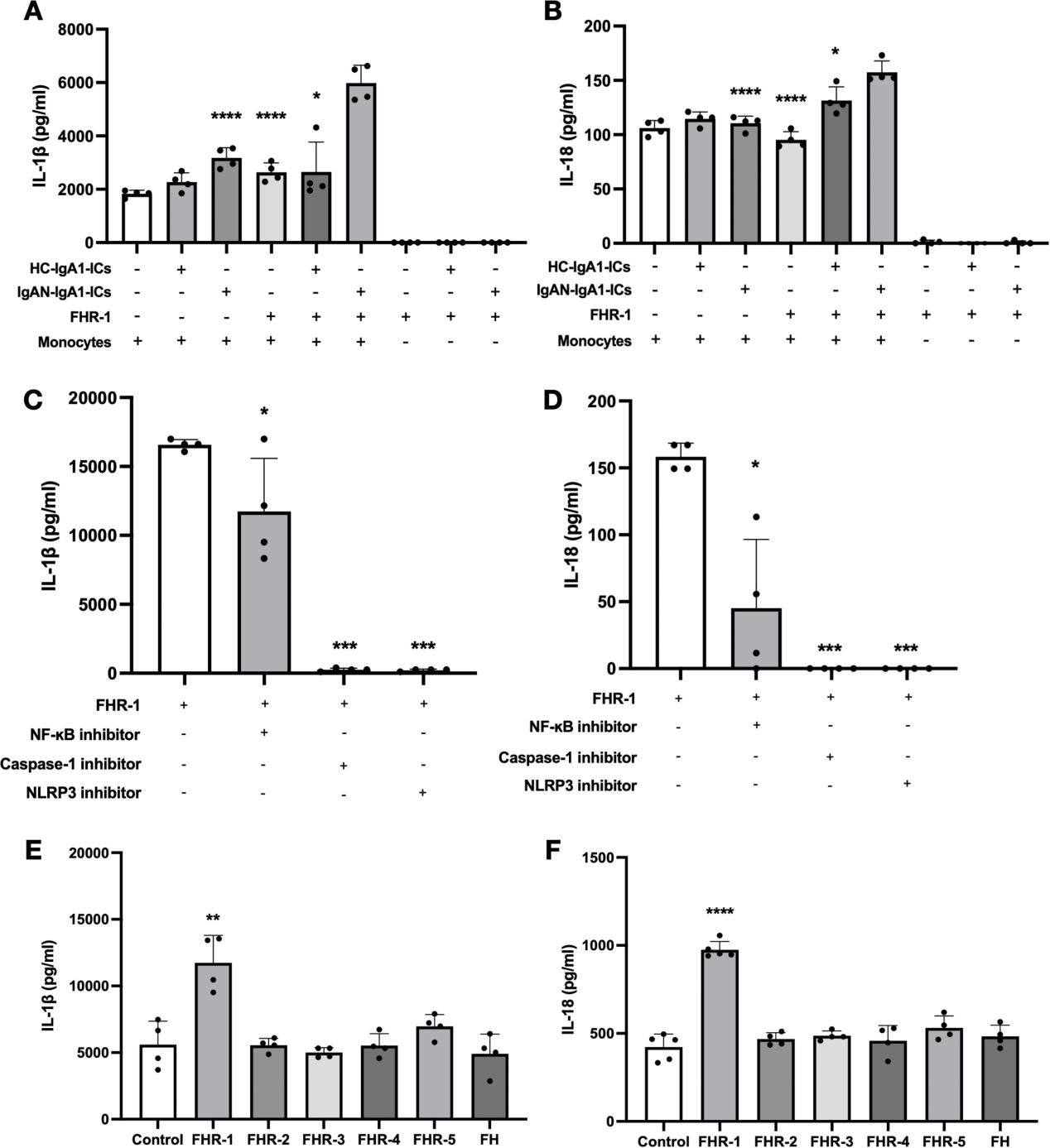 在系膜-单核细胞共培养体系中,FHR-1可显著诱导IL-1β和IL-18分泌,单独培养系膜细胞时不出现此效应,提示主要炎症来源于单核细胞。进一步研究发现,抑制NFκB(核因子κB)、NLRP3(NLRP3炎性小体)和caspase-1(半胱天冬酶-1)可几乎完全阻断IL-1β和IL-18的分泌(图2,C-D),这一结果进一步支持了上述结论。