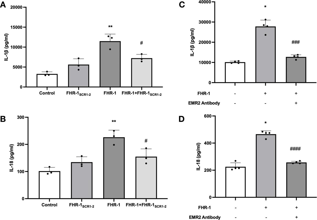 FHR-1直接触发单核细胞炎症:FHR-1与单核细胞受体EMR2结合可直接触发炎症反应。使用FHR-1SCR1-2干扰FHR-1与肾小球系膜细胞的结合(图3,A-B),或者使用EMR2抗体FHR-1与单核细胞上EMR2受体的结合(图3,C-D),均显著降低IL-1β和IL-18水平。