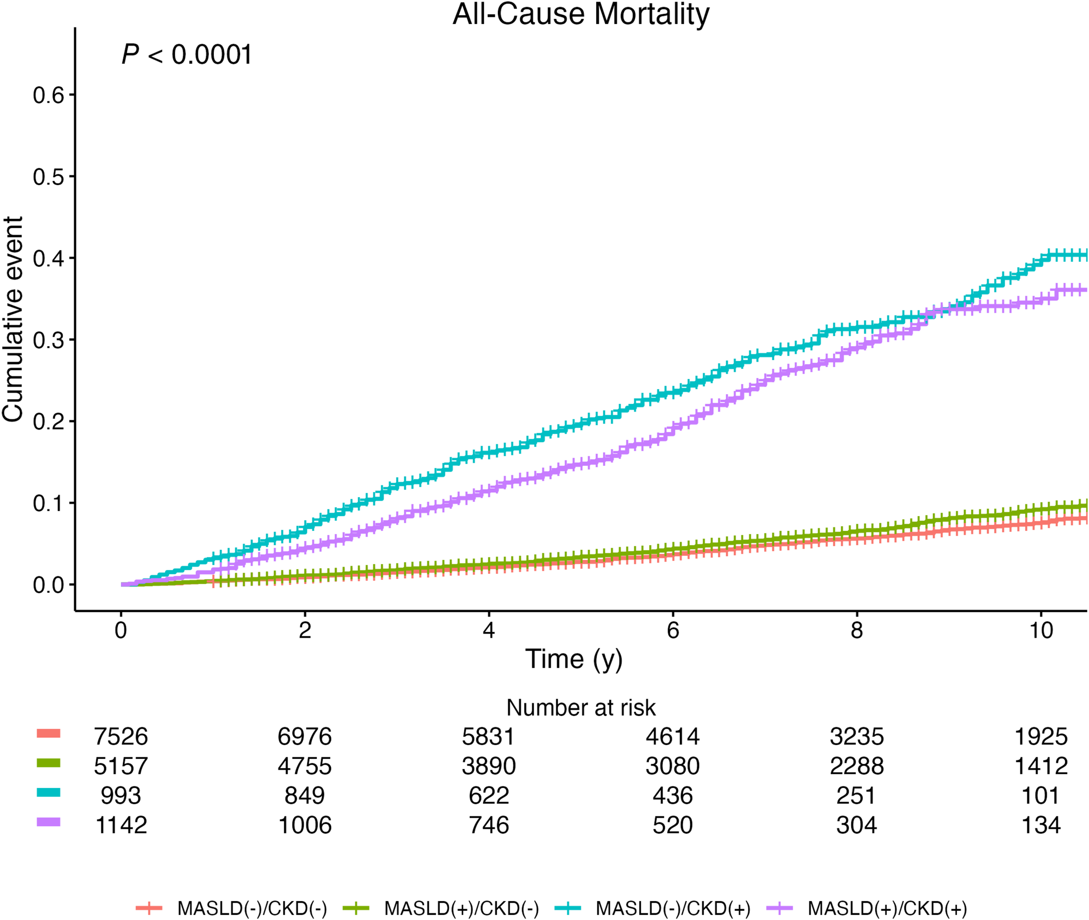 值得注意的是,MASLD(+)/CKD(-)表型的死亡风险在校正后未达到统计学显著性(aHR=1.48,P=0.165)。