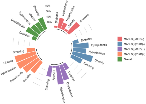 关键研究发现1、MASLD(+)/CKD(+)表型呈现最高的心肾代谢共病负担