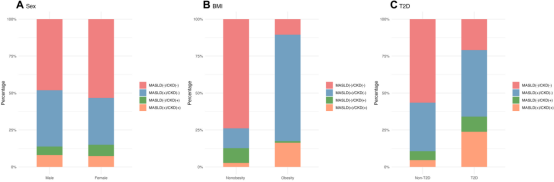 图1. 根据性别(A)、体重指数(B)和 T2D(C)分层的 MASLD 和 CKD 表型