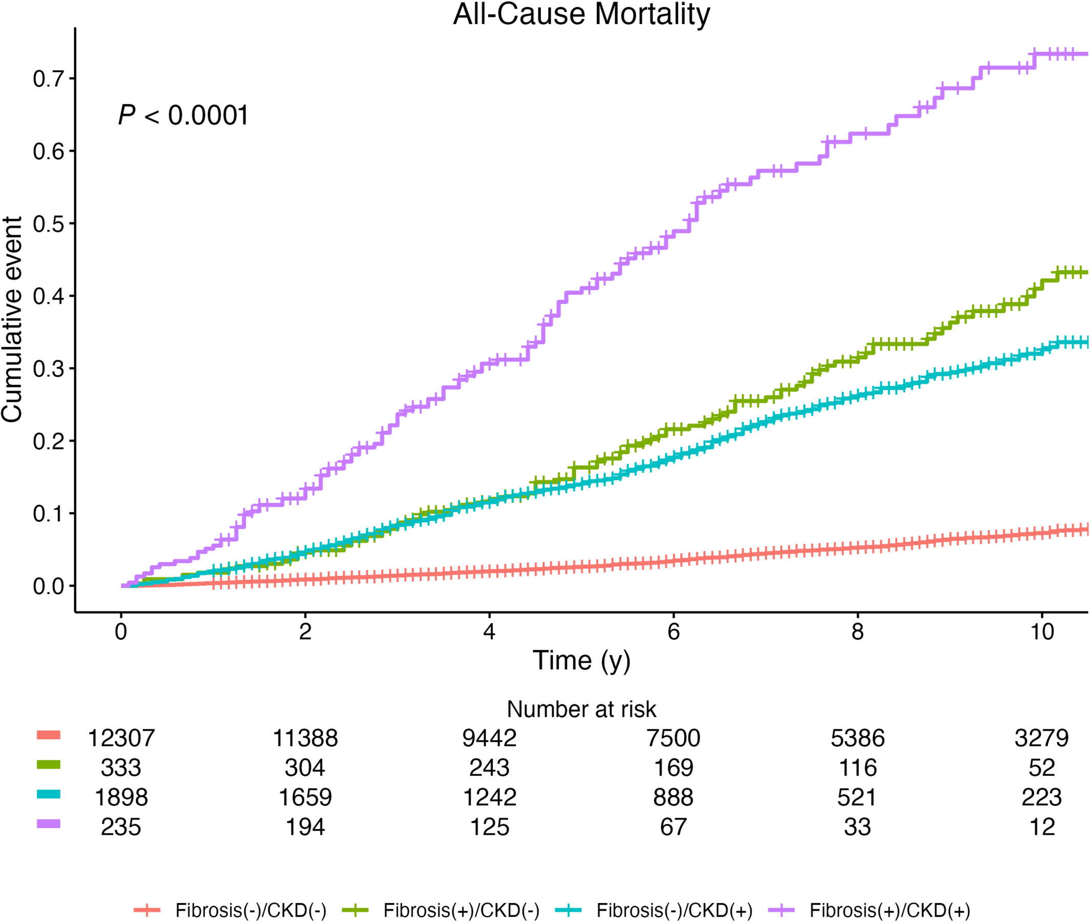 图5. 根据纤维化和CKD状态分层,10年全因死亡的Kaplan-Meier曲线