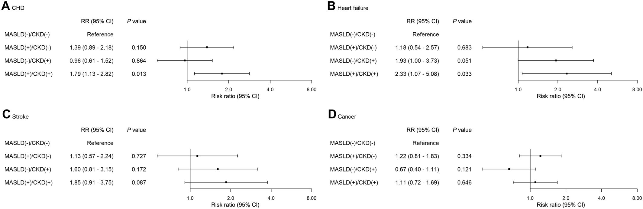 在次要终点方面,MASLD(+)/CKD(+)表型与冠心病(RR=1.79)和心力衰竭(RR=2.33)风险增加相关。MASLD/CKD表型均未显示出与卒中或癌症风险有显著关联(图4)。
