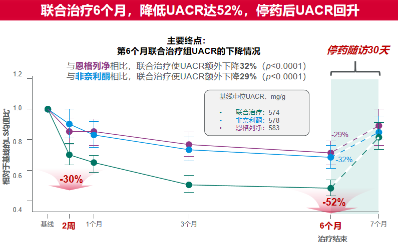 本病例中,患者在非奈利酮减量后2.5个月时,复查发现UACR反弹。加量到20 mg治疗2个月,再次复查UACR明显下降。提示需要标准剂量维持治疗。相关研究也支持长期治疗这一观点,如CONFIDENCE研究显示停药一个月UACR几乎回升到基线值[4](图2),ARTS-DN研究显示停止非奈利酮治疗1个月后UACR再次升高[9],FIDELITY研究亚组分析发现中断非奈利酮治疗后,肾脏和心血管获益减弱[10](图3)。因此,加强患者教育,保证依从性是改善预后的关键。