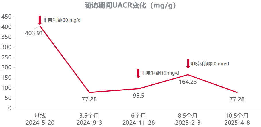 治疗8.5个月(减量2.5个月后):UACR反弹至164.23mg/g,较减量前明显升高,复查血钾4.87 mmol/L, eGFR 108.4 ml/(min·1.73 m2)。问明原因后再次将非奈利酮剂量升至20 mg QD。HbA1c 6.5%,继续目前降糖等治疗。