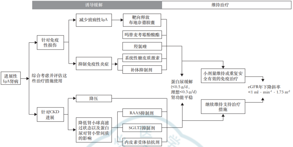 达到短期治疗目标后(蛋白尿缓解[蛋白尿<0.5 g/d,理想情况<0.3 g/d]),在维持治疗阶段,建议采取小剂量维持或重复安全有效的免疫治疗,避免病情反弹,尤其是存在高进展风险人群。