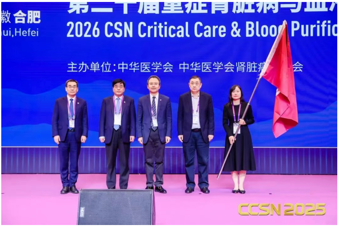 作为中华医学会肾脏病学分会的重要年度学术活动之一,中华医学会肾脏病学分会第二十届重症肾脏病与血液净化大会将于2026年5月在安徽省合肥市召开。此次闭幕式上,在蔡广研教授的主持和传递下,以邵凤民教授和赵占正教授领衔的郑州团队将中华医学会肾脏病学分会会旗交接给以吴永贵教授、张培教授领衔的合肥团队。会旗交接象征着我国肾脏病学分会学术薪火的传承与接力。