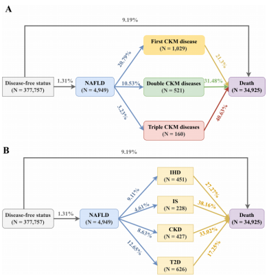 研究纳入英国生物样本库中377 757名基线无NAFLD及CKM疾病的参与者,平均年龄57岁,男性占44.5%。CKM疾病定义包括缺血性卒中(IS)、缺血性心脏病(IHD)、T2DM及CKD。研究排除了随访中断或关键变量缺失者。