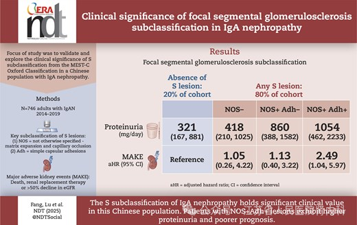 近日,江苏省人民医院(南京医科大学第一附属医院、江苏省妇幼保健院)肾内科袁杨刚教授团队在欧洲肾脏协会(ERA)的官方期刊Nephrology Dialysis Transplantation上发表题为“Clinical significance of focal segmental glomerulosclerosis subclassification in lgA nephropathy”的研究论文,为IgA肾病的S病理亚分型提供了证据及依据病理分型采取不同治疗策略提供了研究方向。