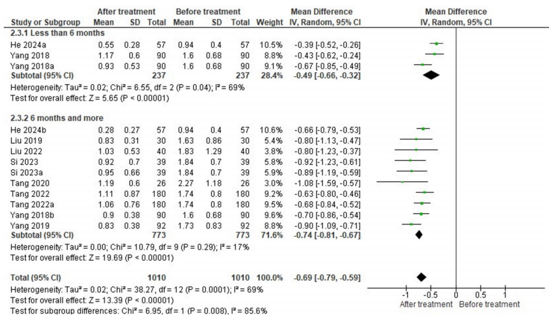 在8项报告羟氯喹治疗结束时患者24小时尿蛋白水平的研究中,汇总分析结果显示:羟氯喹治疗后24小时尿蛋白较基线显著下降(均差[MD]:-0.69,95%CI:-0.79 ~ -0.59,P<0.00001),在纳入的研究中观察到中度异质性(I2= 85.6%,P=0.008)(图1)。无论短期治疗(MD:-0.49,95%CI:-0.66 ~ -0.32)还是长期治疗(MD:-0.74,95%CI:-0.81 ~ -0.67),均显示蛋白尿水平明显改善。