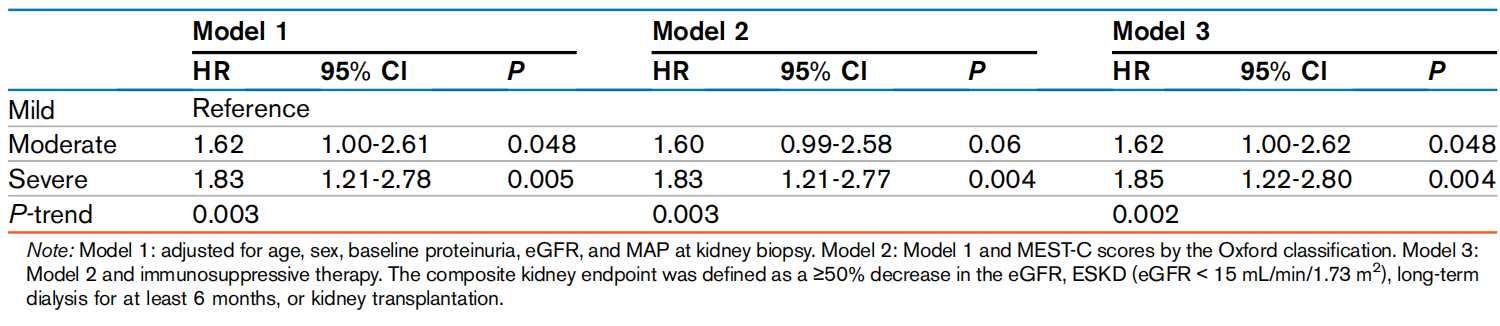 此外,重度FPE患者的肾脏不良结局风险高于中度FPE患者(HR 分别为 1.85 vs 1.62),且风险随FPE程度加重呈显著上升趋势(趋势P=0.002)(表2)。
