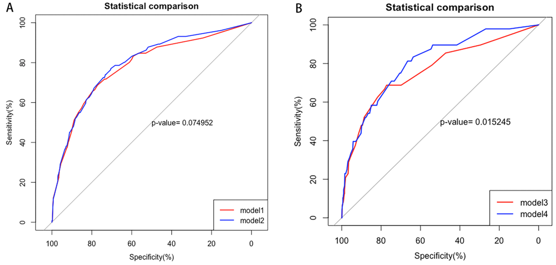 预测模型评估方面,总队列中,仅包含24-h UTP、eGFR、糖皮质激素使用及T评分的模型1(AUC=0.782,95%CI:0.7378-0.8267),在纳入GS比例后形成的模型2,AUC提升至0.795(95%CI:0.753-0.837);匹配队列中,模型3(不含GS,AUC=0.764,95%CI:0.6859-0.8427)纳入GS比例后形成的模型4,AUC显著提升至0.804(95%CI:0.74-0.868,P=0.015,图2)。此外,cNRI 和 IDI 分析显示,纳入 GS 比例后,两组模型的判别能力均有改善,尤其是匹配队列中 IDI 显著增加(P=0.001),证实 GS 比例可显著提升 IgA 肾病预后预测模型的准确性。