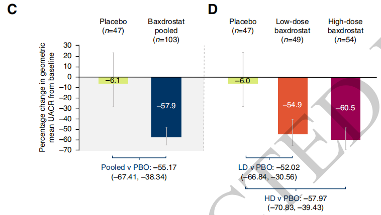 4、蛋白尿:第26周,baxdrostat合并组UACR几何均值下降55.2%,安慰剂组下降6.1%,校正后净下降约50%;LD组下降52%,HD组下降58%(图2)。