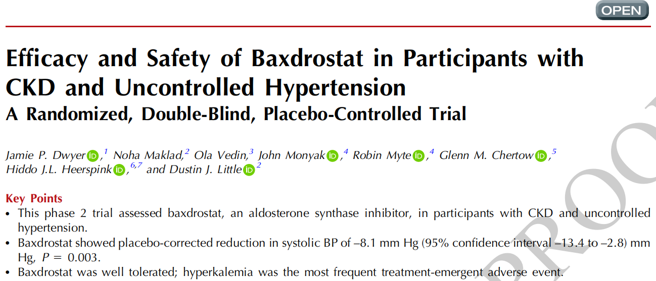 Baxdrostat(CIN-107)是一种高选择性醛固酮合成酶抑制剂(ASI),对CYP11B2的抑制强度为CYP11B1的100倍,理论上可在不影响皮质醇合成的前提下持续降低醛固酮。前期BrigHTN 2期试验显示,baxdrostat对难治性高血压具显著降压作用,但CKD人群的安全有效性尚待验证。为此,研究者设计了FigHTN试验,旨在评估baxdrostat在合并CKD且血压未控制患者中的疗效、安全性及蛋白尿改善潜力。